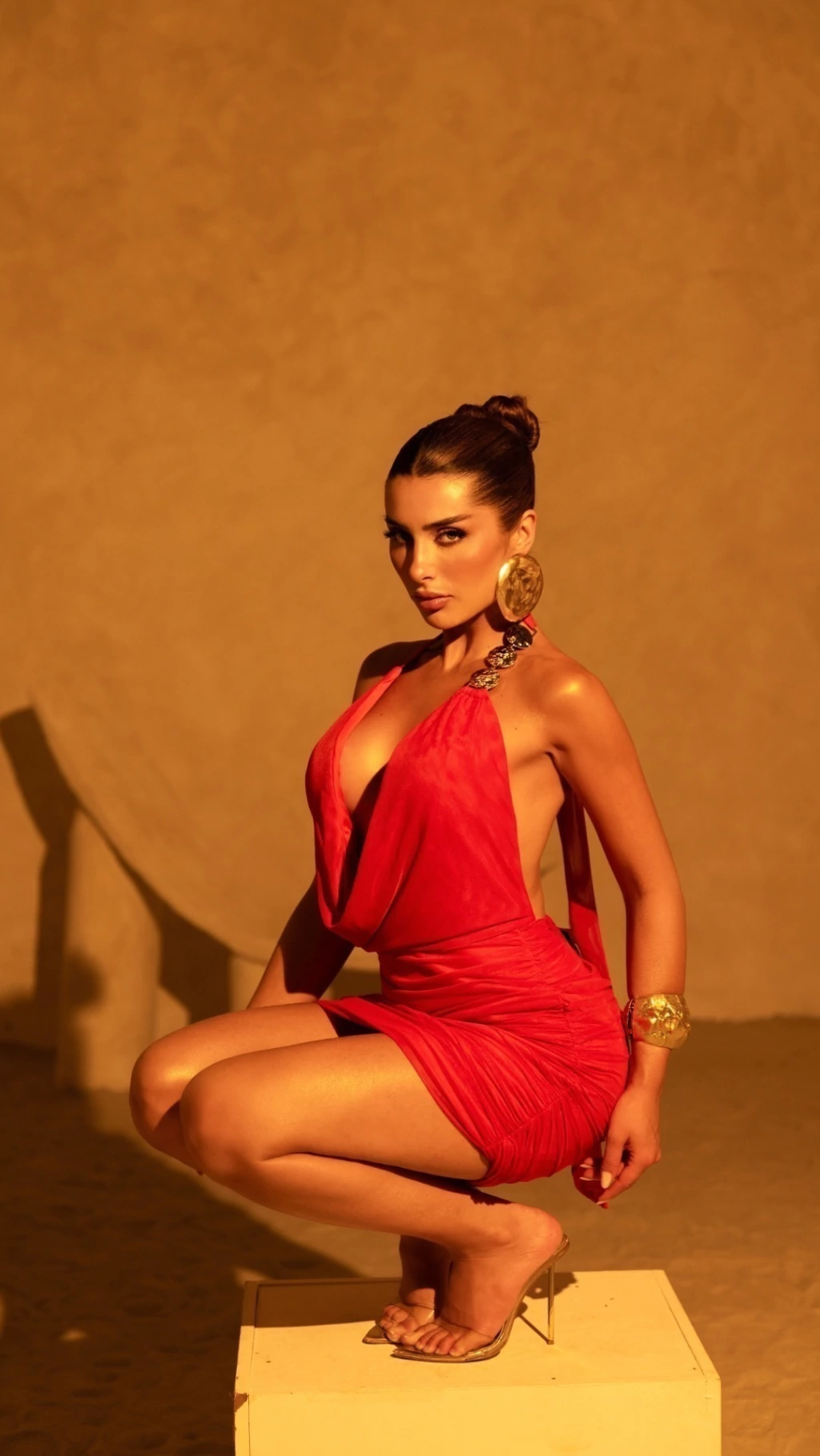 O grande destaque é o drapeado completo, que valoriza a silhueta de forma harmônica, criando um efeito escultural que alonga e realça a feminilidade com elegância.